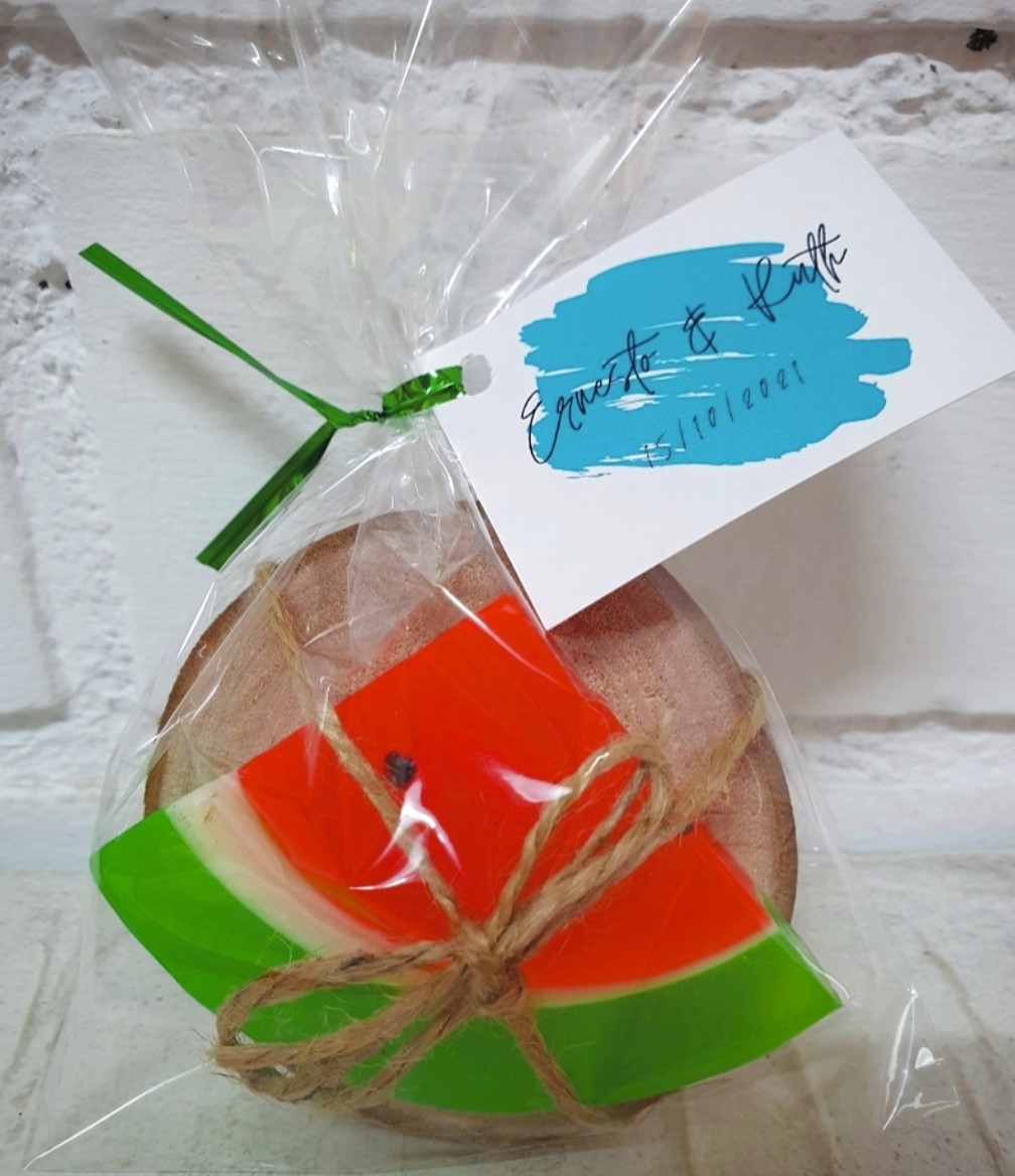 Detalle de jabón de sandía mini de 25 gramos sobre soporte de madera.