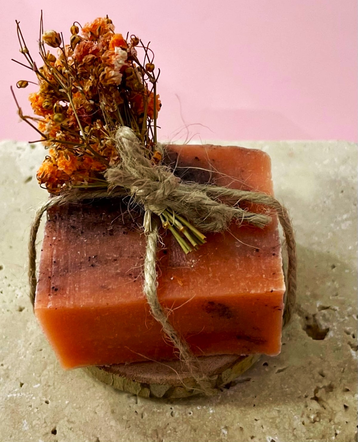 Jabón de naranja y canela, sobre soporte de rodaja de madera y decorado con ramillete de flor natural seca de paniculata.